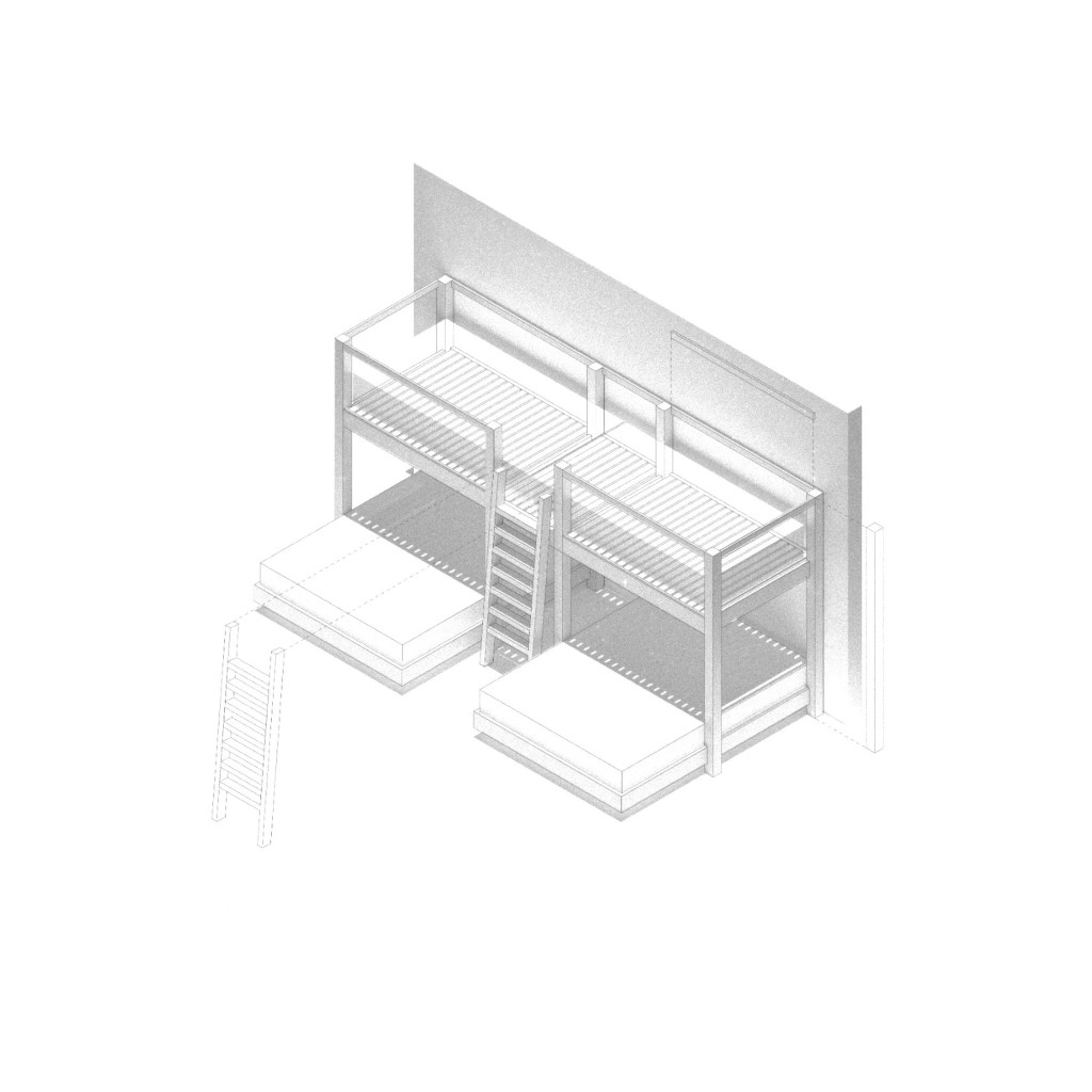 By imagining where one lies down as a design moment in itself, the project explores simple geometries that shape atmosphere and domesticity. The beds are embedded within a crafted wooden frame that both contains and defines the surrounding space, allowing light, texture, and shadow to articulate the act of resting. The result is a piece that resolves functional constraints without sacrificing spatial richness, making the everyday routine of going to bed a deliberate encounter with material, form, and ambiance. In this way, the bunk bed becomes a small architectural intervention that enhances how one inhabits the home.