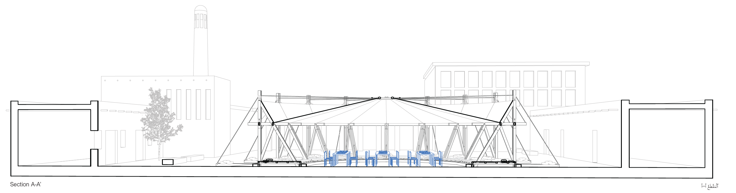 Located in the courtyard of the Mohammed bin Jassim House within Msheireb Museums, the pavilion is embedded in a district historically linked to water, knowledge, and the discovery of oil. The project reinterprets two Gulf typologies—the tent and the well—through a modular timber structure with a light, semi-permeable canopy. A pulley system inspired by traditional wells lifts the canopy, recalling the act of drawing resources from the ground and reinforcing Msheireb’s role as a place of gathering and exchange.