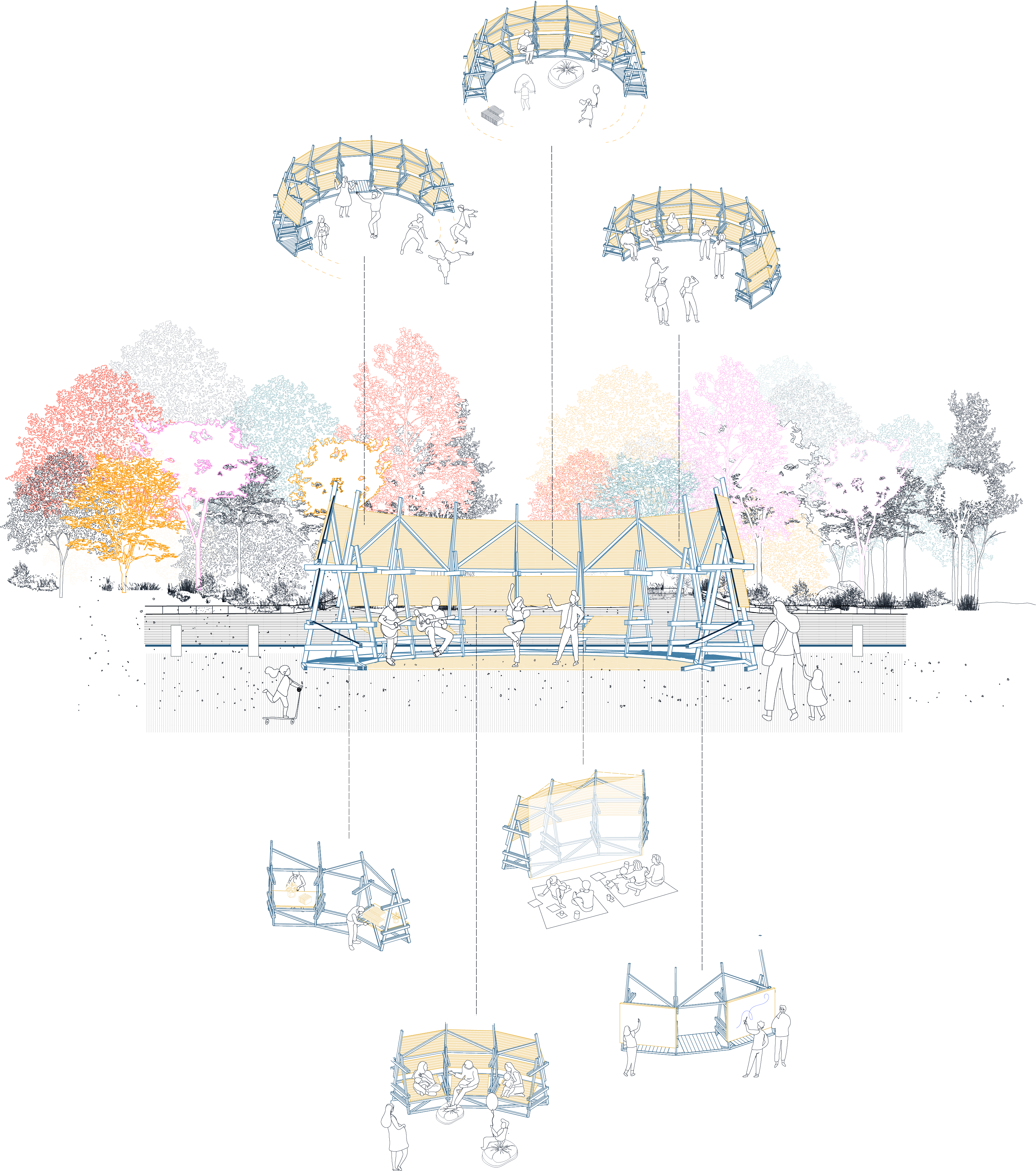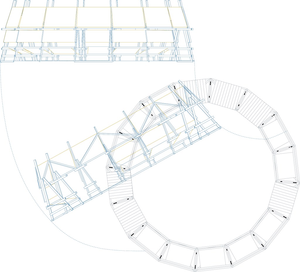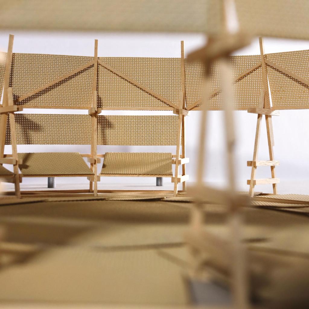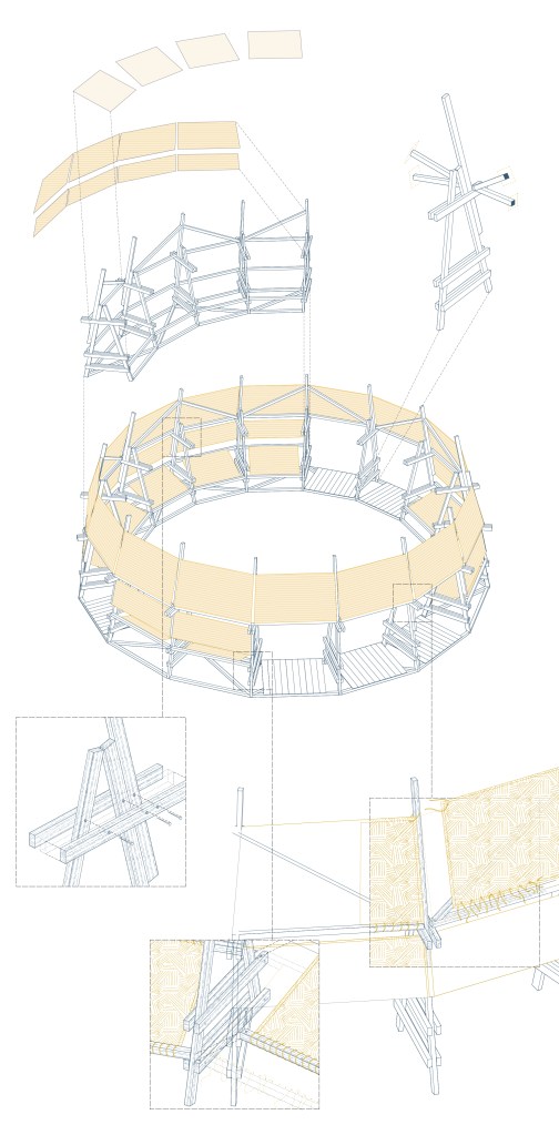 The pavilion is conceived as an open, adaptable, and appropriable infrastructure, inspired by Umberto Eco’s idea of the “open work”. Its porous structure enables multiple uses and non-hierarchical relationships between communities, designers, and the urban context. Built from a modular grid of fir wood slats assembled with dry systems, it is lightweight, reversible, and easy to relocate. Through a slow strategy centered on everyday life, Plaza Nómada makes visible practices of maintenance, hospitality, and care, framing architecture as a political practice that promotes citizenship rather than a finished form.