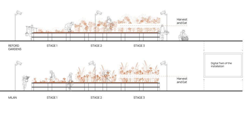 The project introduces a second layer by doubling the garden through a digital connection. A screen allows visitors to see an identical table located in Milan, where other participants are planting and cultivating different seeds. The two gardens evolve in parallel, connected in real time yet never identical. Each reflects distinct gestures, environmental conditions, and rhythms of care.