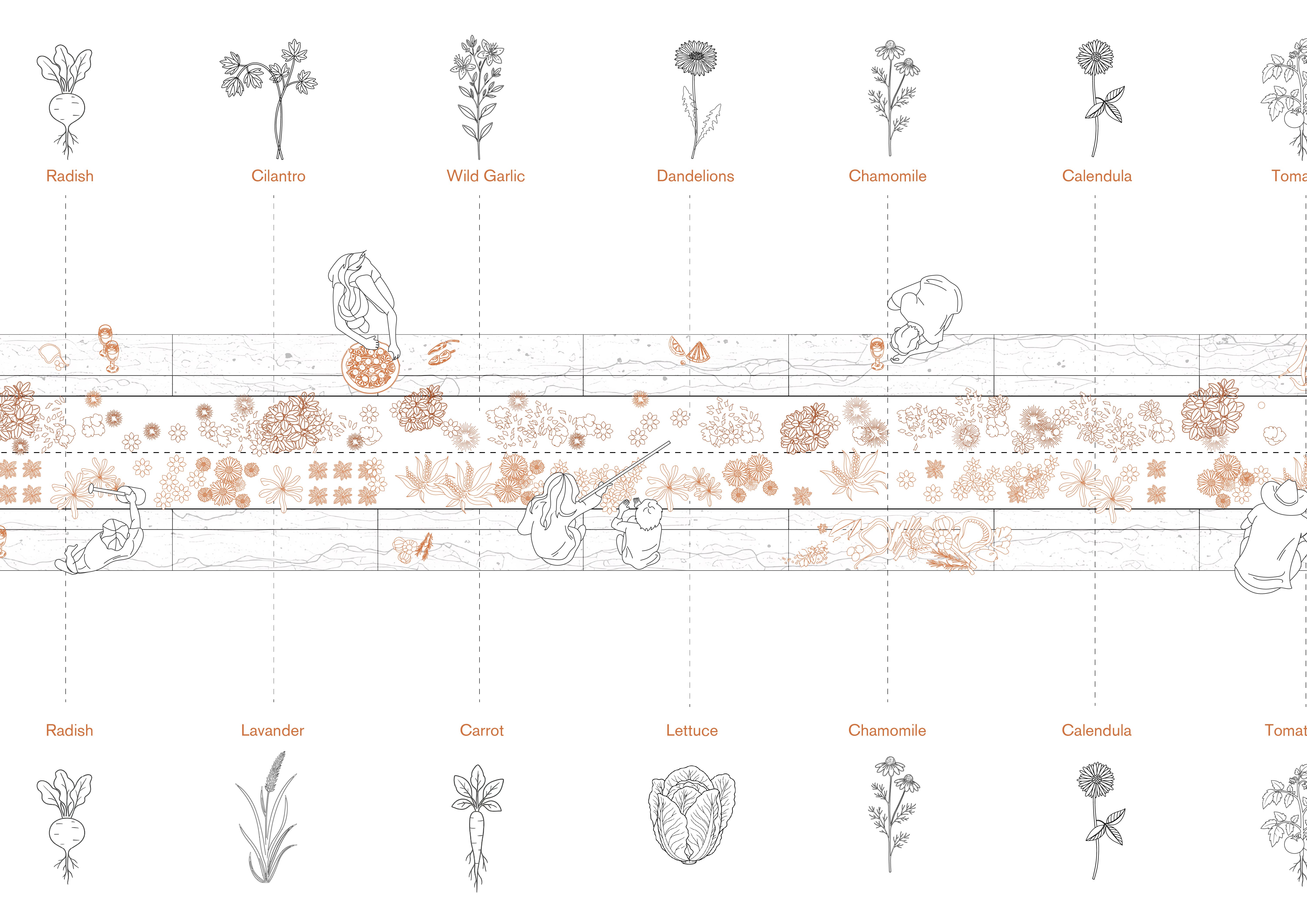 The garden invites visitors to gather around a fourteen-meter-long table conceived as a shared ground for encounter, care, and observation. Its surface is covered with a layer of Agrowool that becomes a living canvas, where edible and aromatic seeds can be planted using small wooden sticks. This simple gesture introduces a quiet and deliberate action, one that requires attention, patience, and a willingness to wait. Planting is not framed as a productive task, but as an act of care and shared authorship.