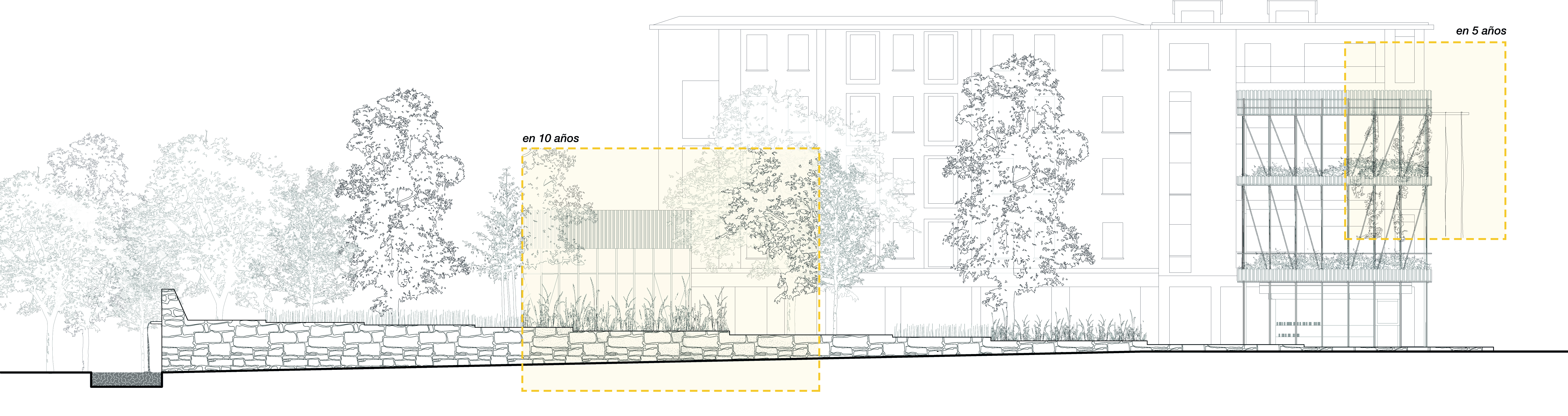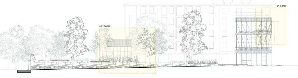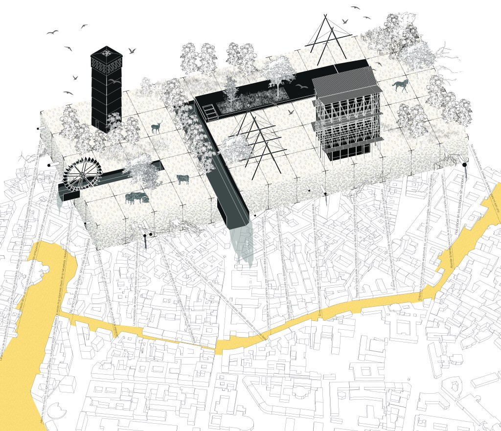 This new system becomes a living infrastructure that supports shared gardens, water basins, and a constellation of small rural-inspired structures such as mills, food preservation devices, and irrigation elements. Built through reuse and low-tech construction, these architectures embrace scarcity as a design value, transforming discarded materials into permanent spatial devices. The result is a mineral ring turned into a productive and inhabited landscape, where biodiversity, microclimatic cooling, and collective care practices converge.