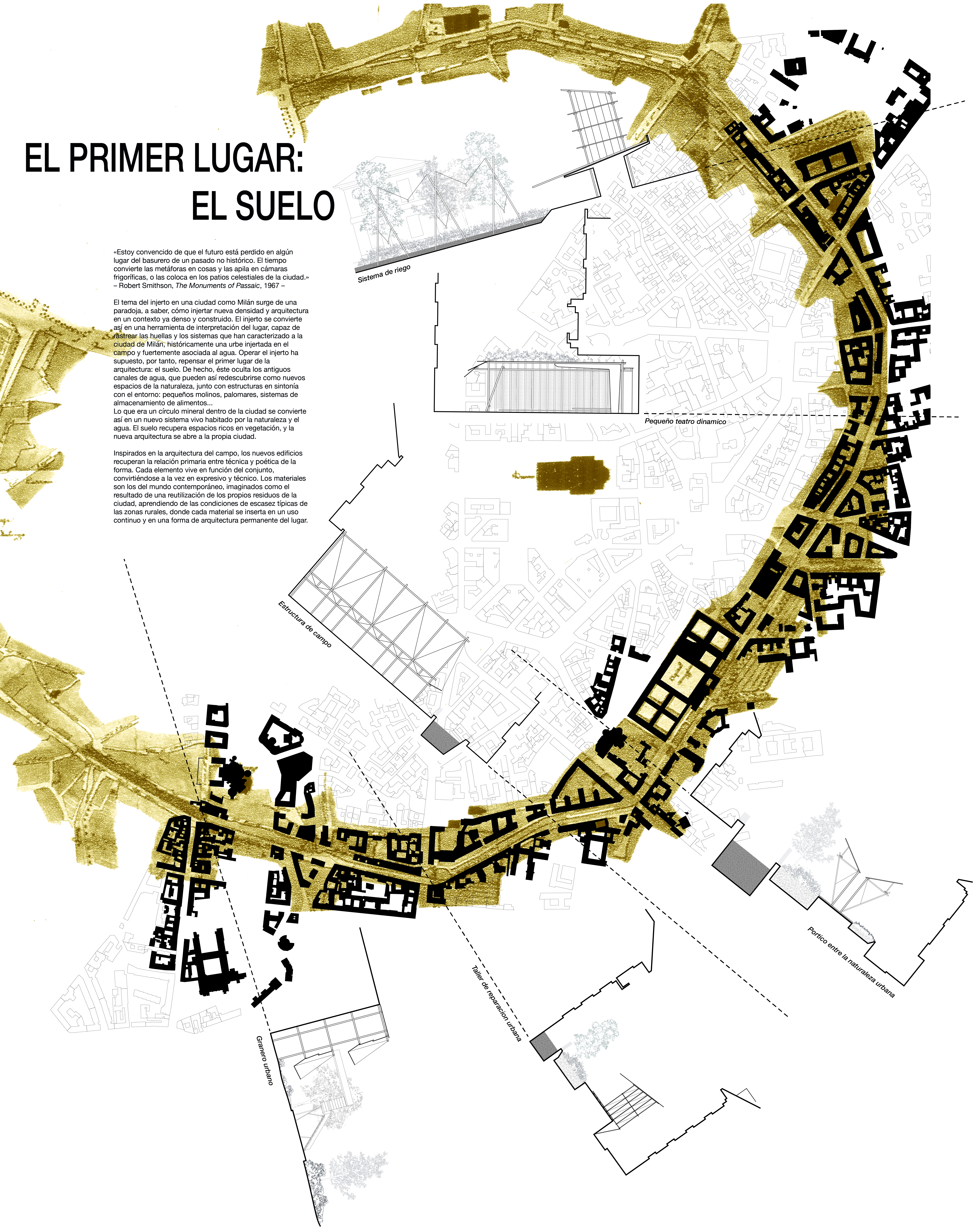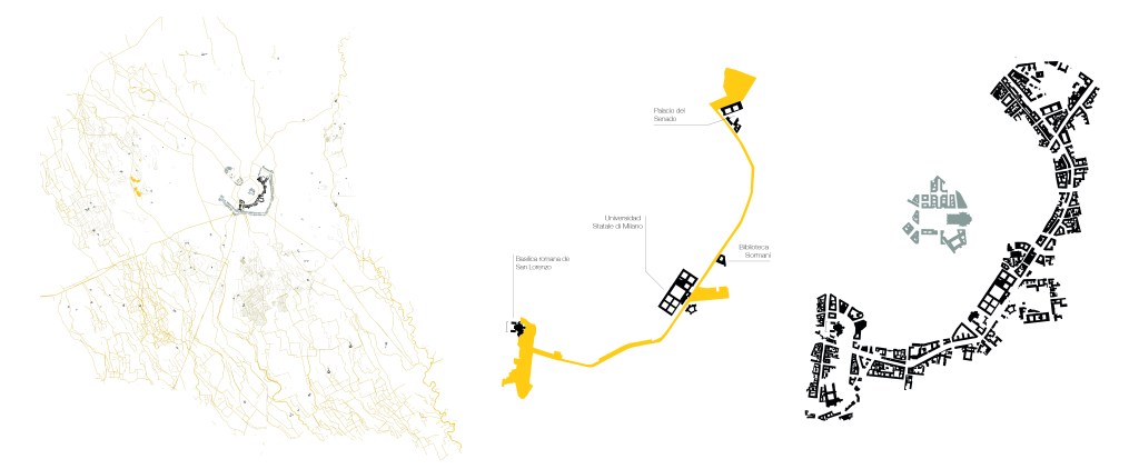 The intervention focuses on the southern sector of Milan’s first ring, along an axis connecting the Basilica of San Lorenzo to Villa Belgiojoso Bonaparte, an area today fully mineralized and strongly affected by the urban heat island. Rather than adding new density, the project works through grafting, using the soil itself as the primary architectural element. Earthworks, terrapieni, and micro-architectures reintroduce permeability, vegetation, and water, while reopening selected historic canals to reestablish an ecological and symbolic proximity between city and nature.